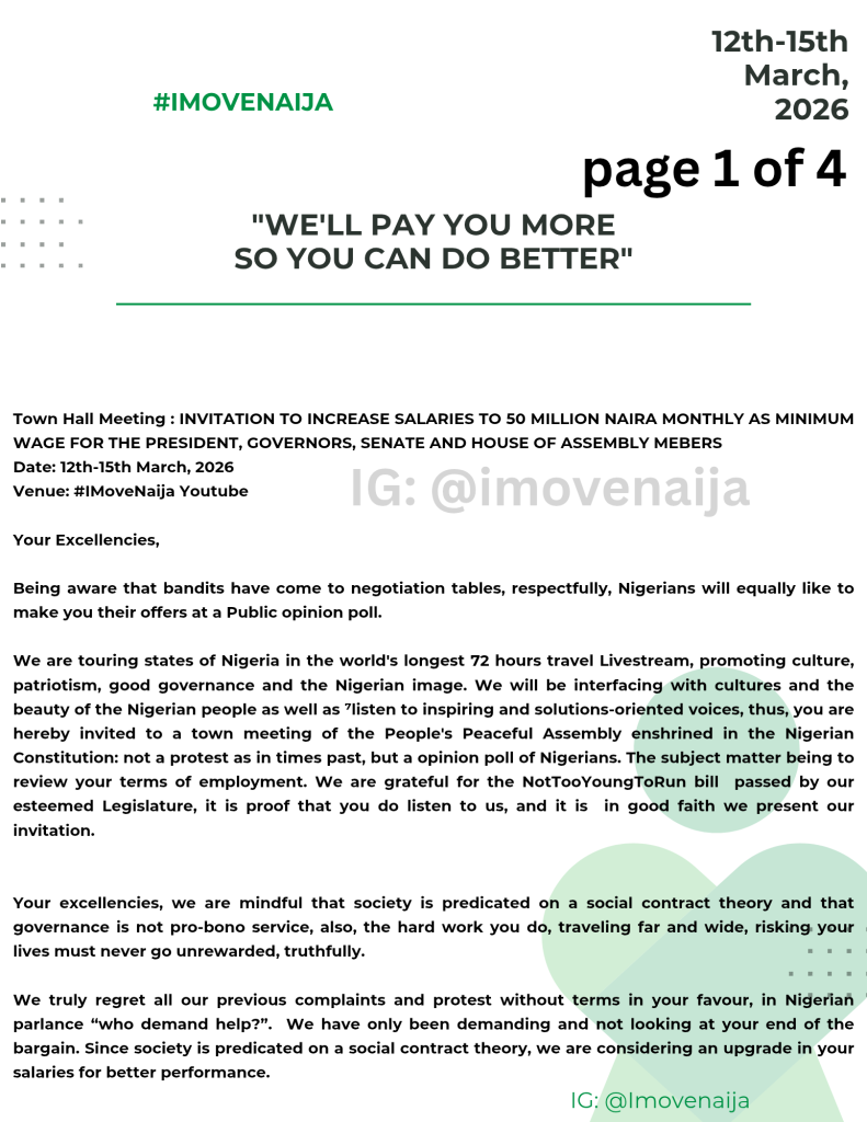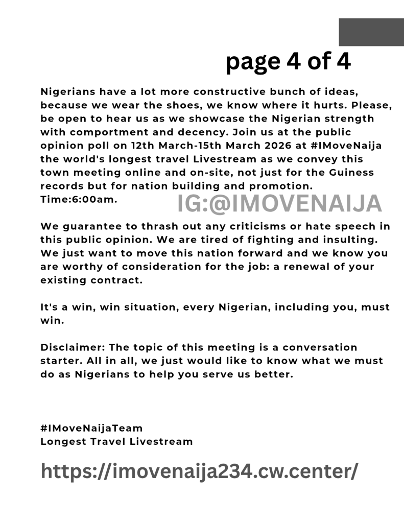 Join us by 1pm on the 3rd of April, 2026 as we make the Guinness World’s Records for the World’s Longest Travel LiveStream. How to be a part of it? Subscribe to our YouTube channel: IMoveNaija https://youtube.com/@imovenaija234?si=FLwvndyi39m2qA9S. Hit the Notification. Share and don’t stop viewing because the guidelines require that we do not fall below 50 viewers all through the Livestream.